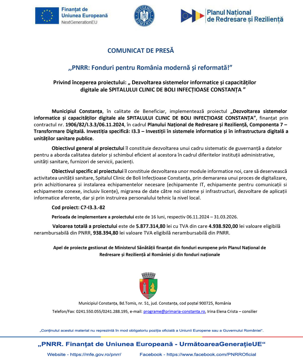 Spitalul Clinic de Boli Infectioase Constanta reprezinta un spital de referinta in judet, atat datorita adresabilitatii existente pe tot parcursul anului (focare de toxiinfectie alimentara, epidemii, boli carantinabile, boli tropicale pentru cei care calatoresc in zonele respective, navigatori etc., Centrul Regional HIV/SIDA si pentru judetul Tulcea, profilaxie si tratament antirabic), iar vara si pentru turisti, cat si datorita calitatii recunoscute a personalului medical.